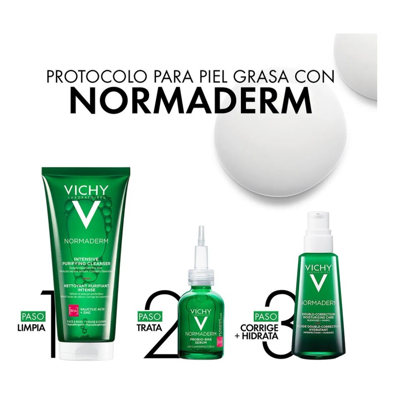 - Tratamiento Vichy Normaderm Doble Corrección 50 ml para pieles con tendencia acneica, formulado con ingredientes dermatológicos de origen natural y con doble eficacia: 1) Reduce las imperfecciones, puntos negros y marcas de acné. 2) Mejora la calidad de la piel proporcionando hidratación por 24 horas, matifica y reduce los poros. Beneficios:
