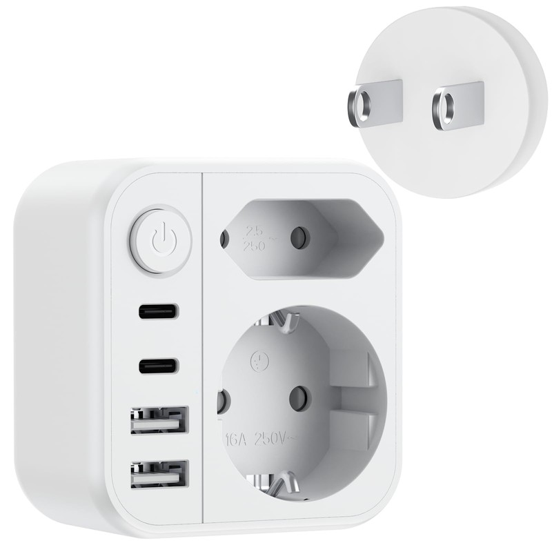 - âă7-in-1 Adapter JapanăDieser 7-in-1 Reiseadapter Typ A ist mit 1 AC-Schuko-Steckdose (Typ E/F), 1 EU-Steckdose (Typ C), 2 USB-C-AnschlĂŒssen, 2 USB-A-AnschlĂŒssen und einem Netzschalter ausgestattet. Mit ihm können 6 GerĂ€te gleichzeitig aufgeladen werden, kompatibel mit Kameras, Mobiltelefonen, Tablets, Laptops, mobilen Netzteilen usw. Dieser 7-in-1 japan adapter erfĂŒllt Ihre Reiseanforderungen â ohne dass zusĂ€tzliche Adapter â und erleichtert so Ihre Reise.