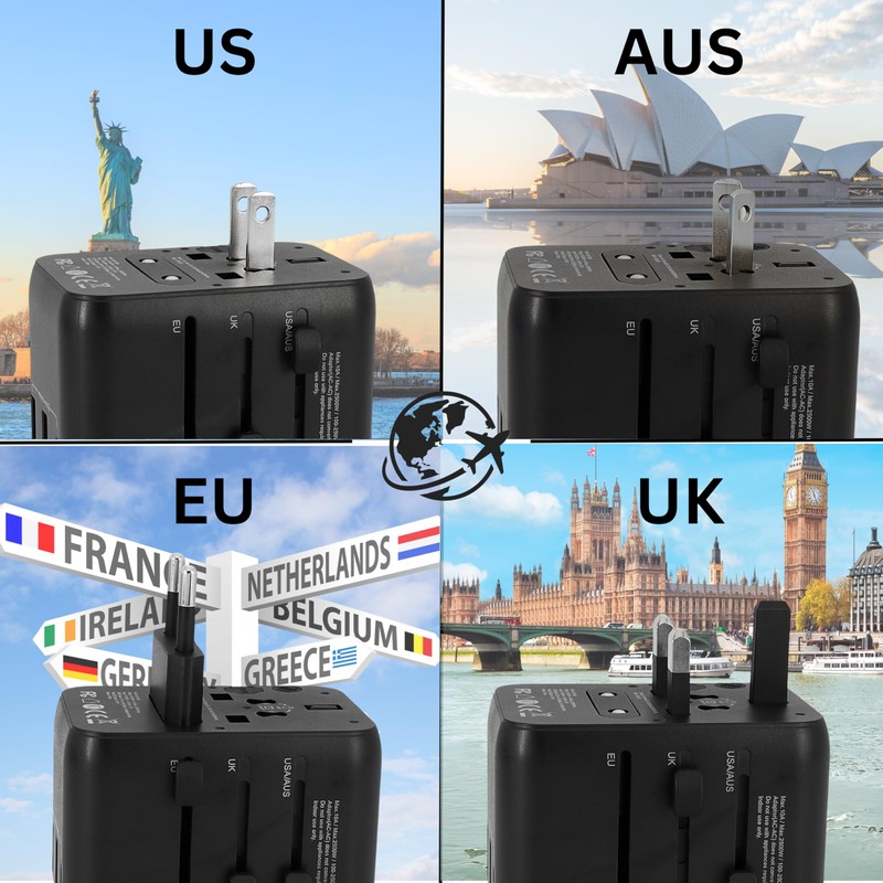 - WORLDWIDE COMPATIBILITY Our travel plugs allow you to charge your devices quickly and efficiently in any country. With the four international plugs (US, EU, UK, AUS), you are well equipped digitally in almost any country