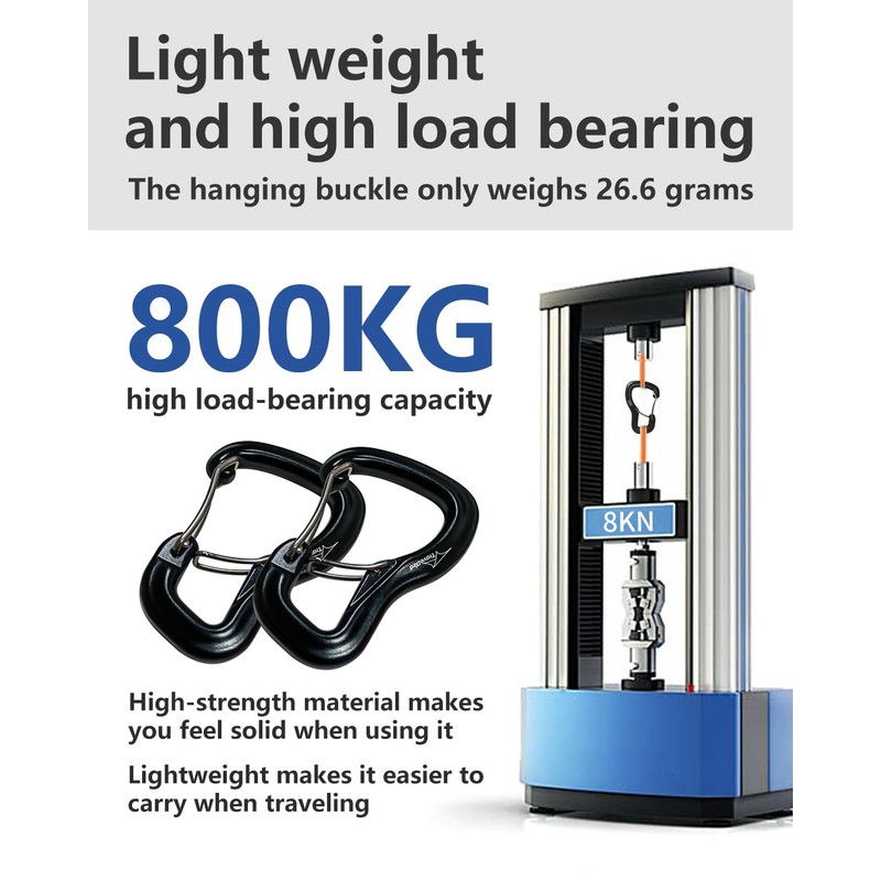 - ⛺【Lightweight High Load Bearing】Weighing only 26 grams, our carabiner clip boasts a high load capacity of 8KN (800KG), making it an excellent choice for outdoor enthusiasts. Its compact design and smooth surface make it easy to carry and operate.