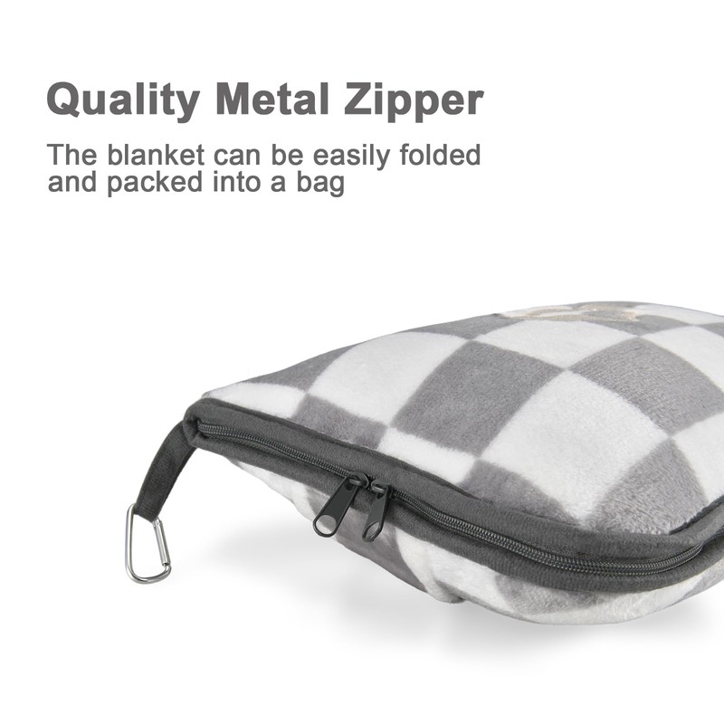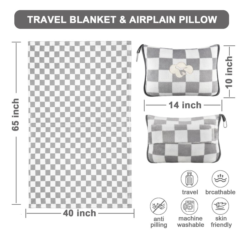 Travel Blanket and Pillow Compact, Premium Soft 2 in 1 Airplane Blanket with Soft Bag Pillowcase,Hand Luggage Sleeve and Backpack Clip (Grey Checkered)