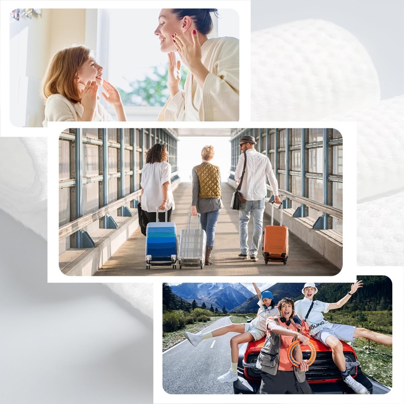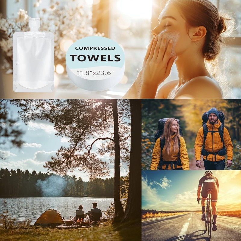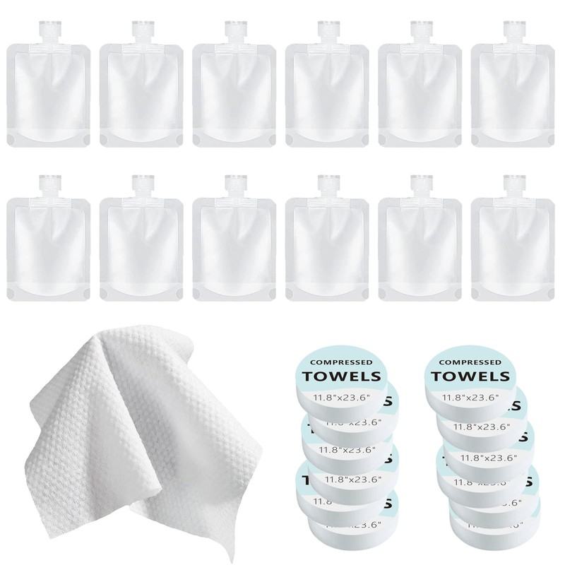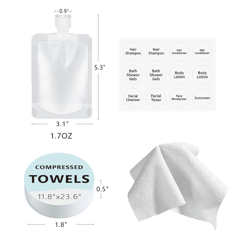 - TSA Approved Travel Bottles Kit: 12 Pieces Refillable Pouches and 12 Pieces Compressed Towels.
