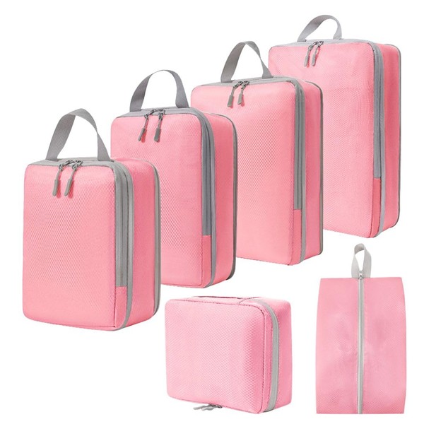 Travel Compact Compression Bags Set of 6 (Pink) Shoe Bag + Amenity Bag + Basic 4 Pack Suitcase Organizer Suitcase Organizer