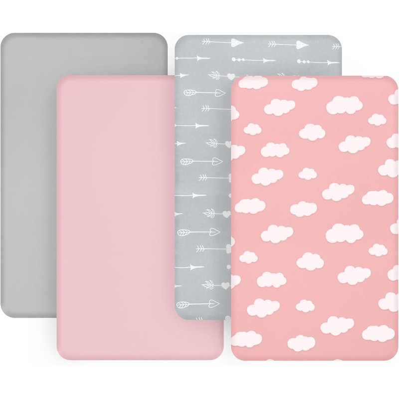 Travel Cot Sheets 95x65cm Fitted, 4 Pack Ultra Soft & Breathable Travel Cot Mattress Sheets, Baby Bedside Crib Sheets, Pink Cloud