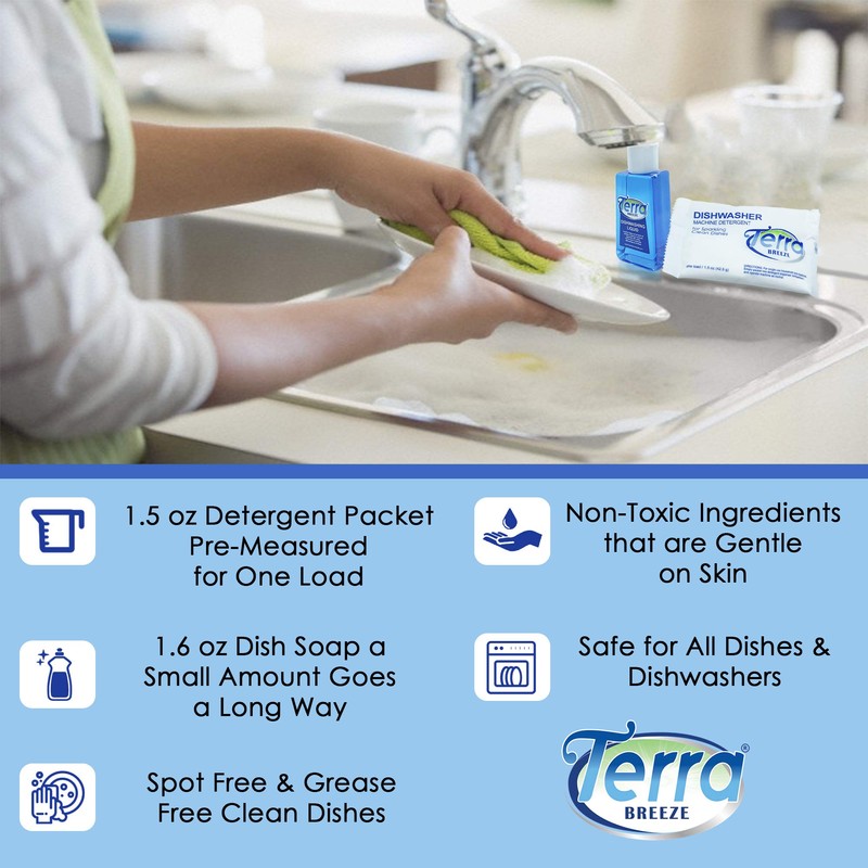 Travel Detergent Packets & Dish Soap | Terra Breeze 1-Shoppe All-In-Kit Bulk Hotel Size Amenities for AirBnB & Rentals | Travel Dish Soap, Dishwasher Detergent & Scent Free Laundry Detergent | 45 Pcs