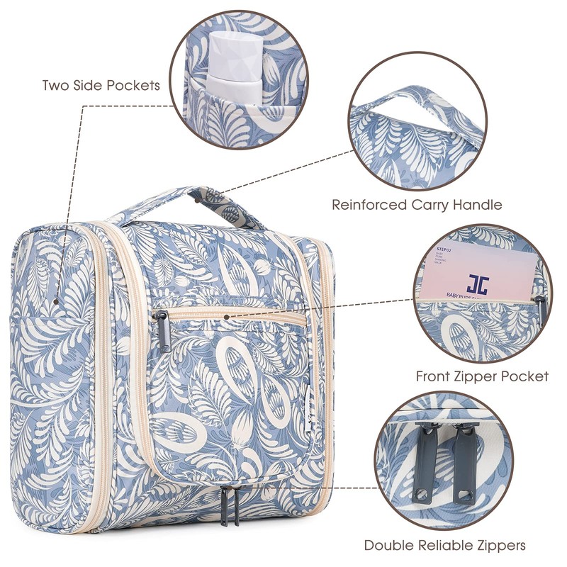Travel Hanging Toiletry Wash Bag Makeup Cosmetic Organizer for Women (Blue Leaf (Large))