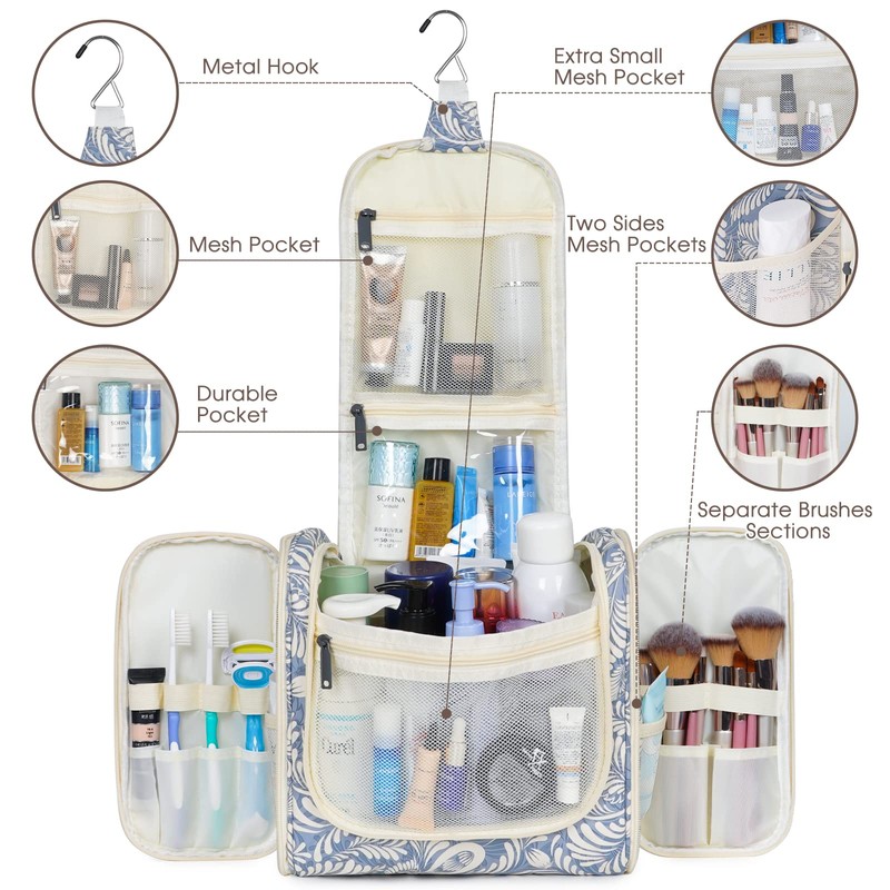 - ✅ DETAILS ORIENTED - Buit-in large metal hook allows hanging the toiletry case from towel rack, coat hook or whereever is available, making your toiletries and cosmetics displayed well for easy access, saving bathroom counter space as well. Water-resistent and durable fabric protects your gear from spills. Soft fabric and reliable zippers. Wide opening and rectangle shape makes it easy to stand on its own.