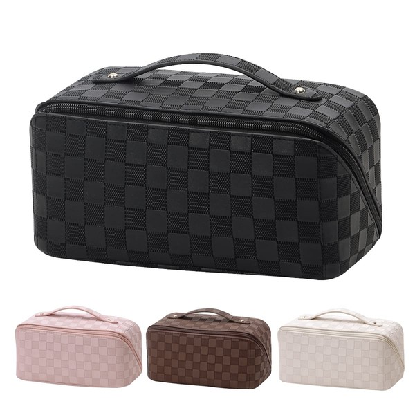 Travel Makeup Bag,Large Double Layer Cosmetic Bag,Waterproof Leather Make up Bag, Portable Leather Toiletry Bag for Women and Girls,Cosmetic Bag Travel Organizer Storage for Travelling (Black-D)