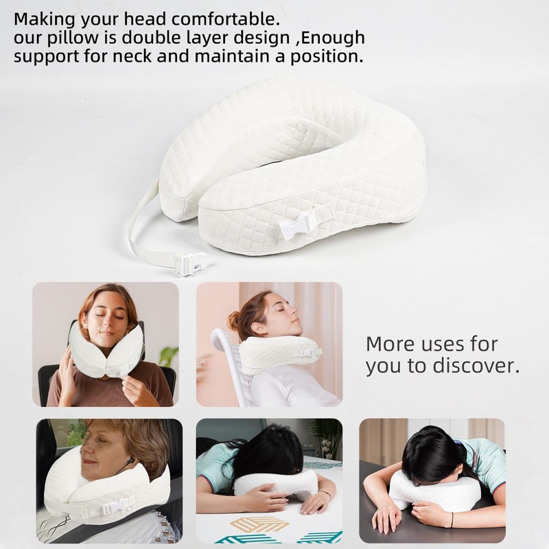Travel Neck Pillow with Premium Memory Foam Adjustable Buckle, Face Down Pillow Breathe Easy with Head Support, Napping Pillow for Airplane, Car, Train, Bus and Home Use White