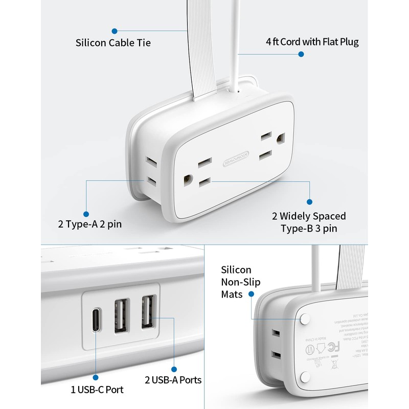 • 【7 in 1 Travel Power Strip with USB C Ports】: 4 AC outlets (2 Type B 3 Prong outlets, 2 Type A 2 Prong outlets), 2 USB-A ports, and 1 USB-C port can power up to 7 essential travel gadgets simultaneously on your desk or nightstand from a single flat plug power strip. Extra space between each AC outlet on the compact power strip provides room for larger plugs, outlets are distributed in different sides without blocking.