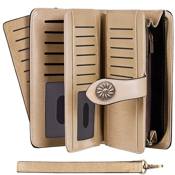Travelambo Womens Wallet Large Capacity RFID Blocking Genuine Leather Wristlet Wallets(Khaki)