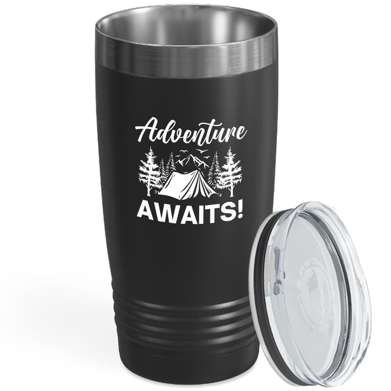 Travelling Tumbler 20oz Black -Adventure Awaits B - Travel Journal Trip Planner Solo Travel Backpacker Guide Couples