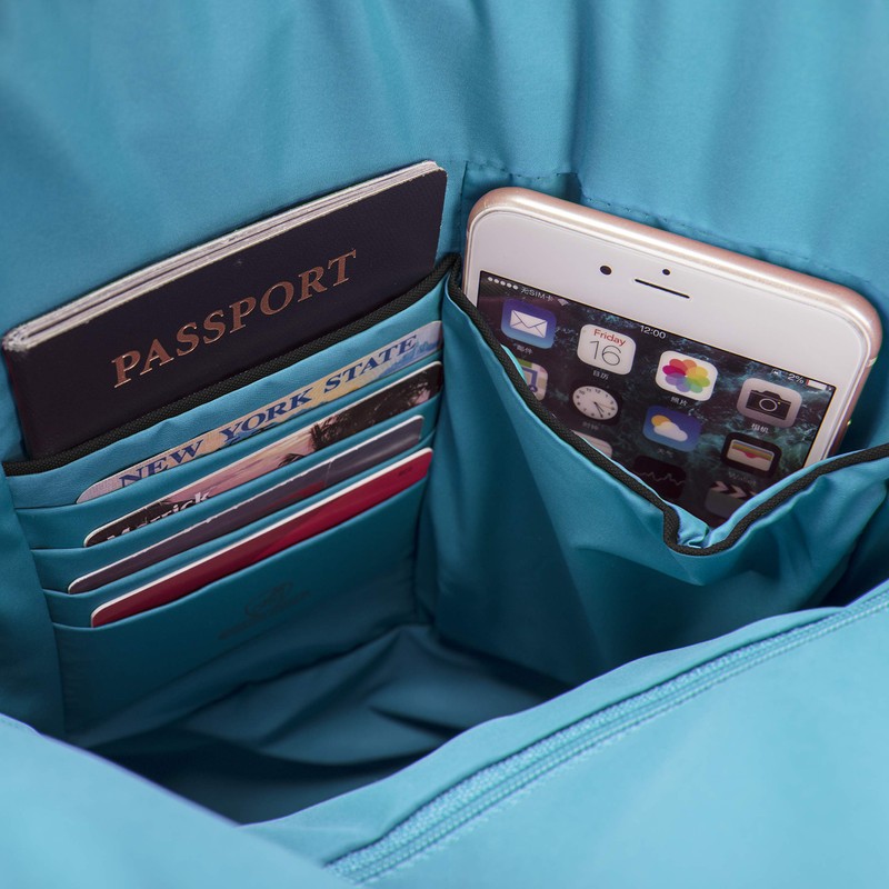 - Anti-Theft features include slash & cut resistant straps and panels, locking zippers, RFID protected card slots and Passport pocket