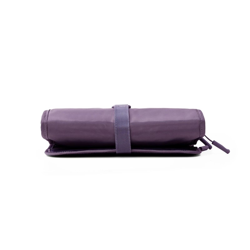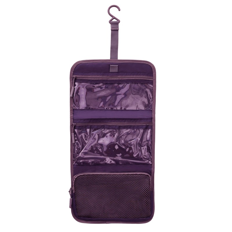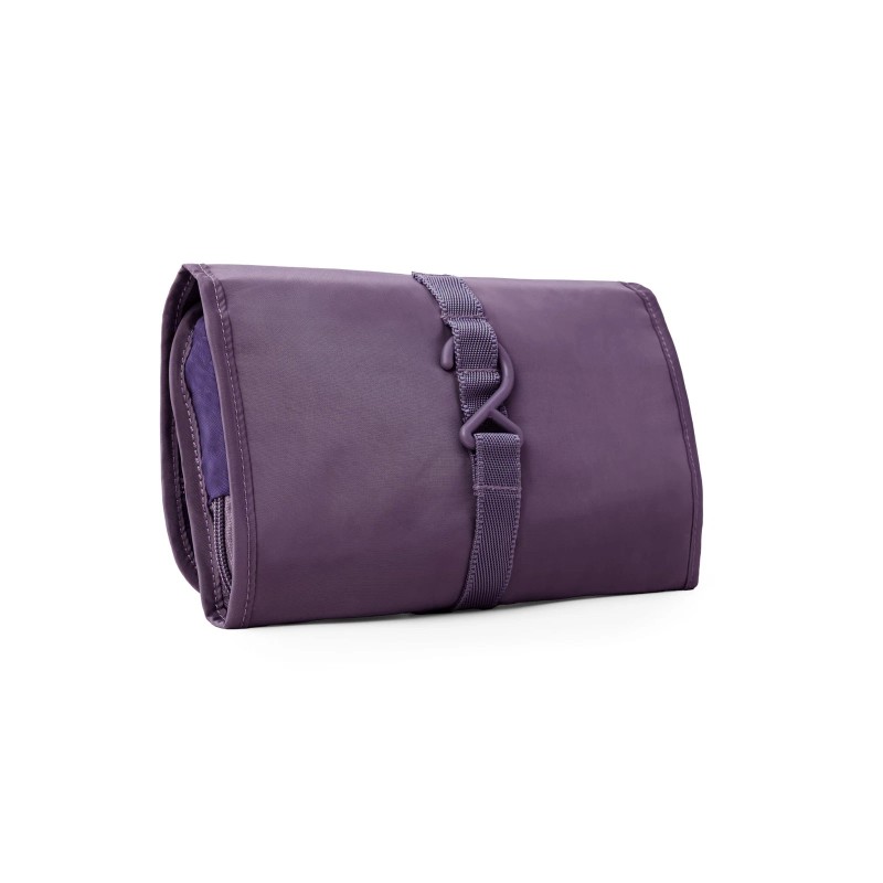 DUAL ACTION HOOK AND STRAP secure the trifold case and toiletries inside, but also hang when you want it open with contents in reach.