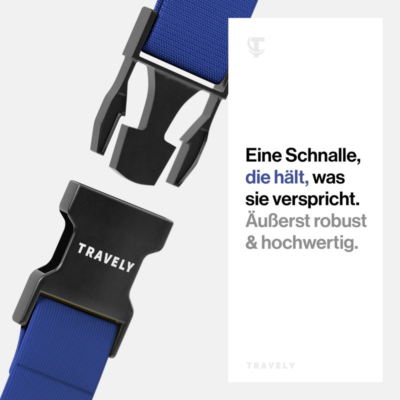 - Easy to adjust: the individually adjustable luggage straps from Travely are ideal for any type of luggage. Thanks to a minimum length of 120 cm and a maximum length of up to two metres, the strap is suitable for securing both large and small luggage items