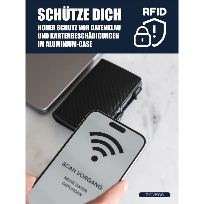 - ULTIMATE CARD AND DATA PROTECTION: Equipped with an RFID protection jacket, the wallet prevents unnoticed data theft, while the aluminium housing protects your cards from damage.