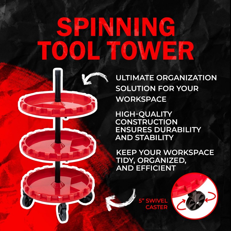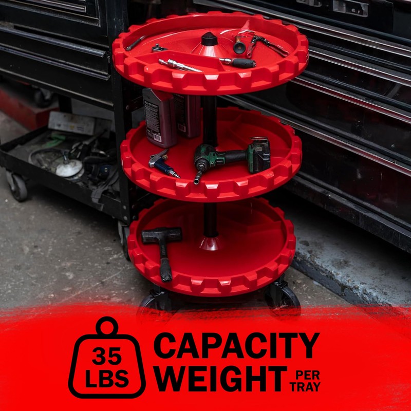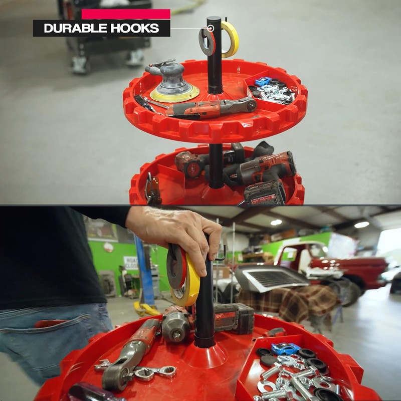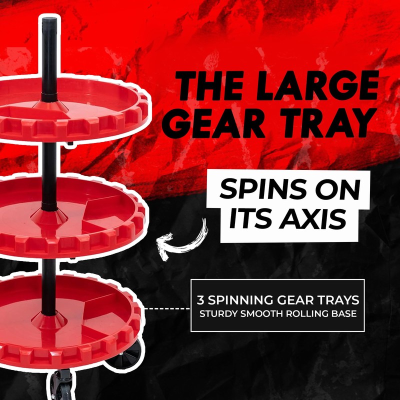 - Large gear trays that spin on their axis that eliminate the need to search through cluttered toolboxes or workbenches
