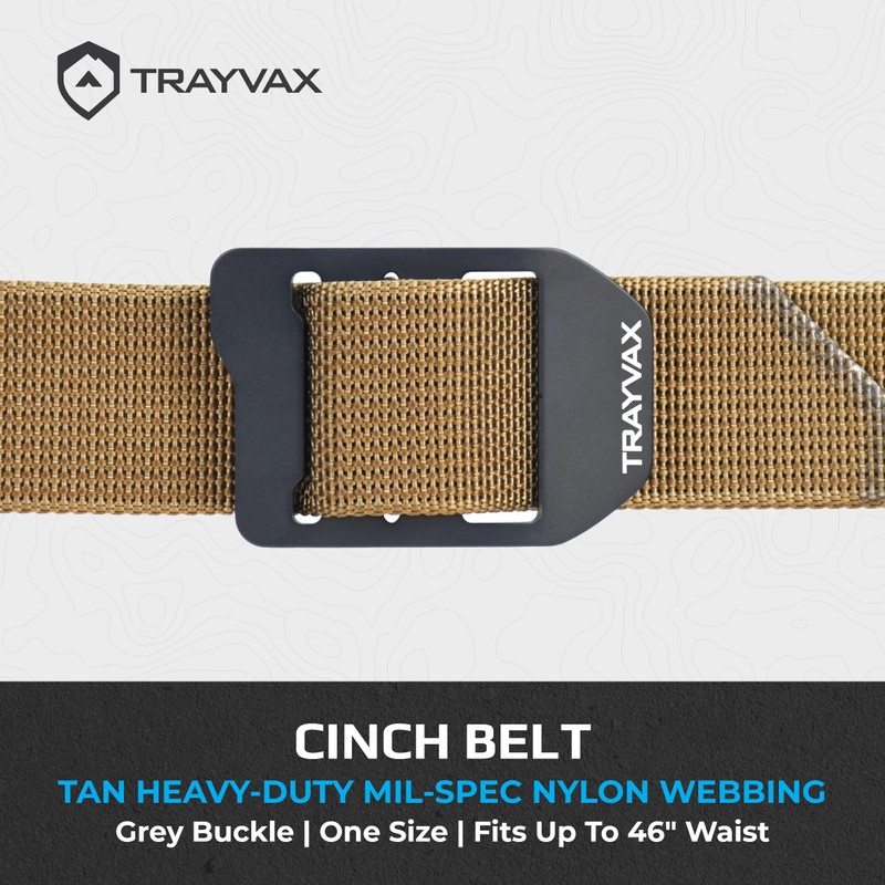 - TACTICAL CINCH BELT: Keep your pants supported while sporting a stylish rugged appearance with the Trayvax Cinch Belt! This hunting belt can accommodate up to a 46 inch waist length, features a high tensile strength of 2000 lbs so that the belt can stretch without fracturing, sports a slim low profile design with a smooth light brush-grain pattern, and the buckle is bent so that it contours with the shape of your body; buckles are interchangeable