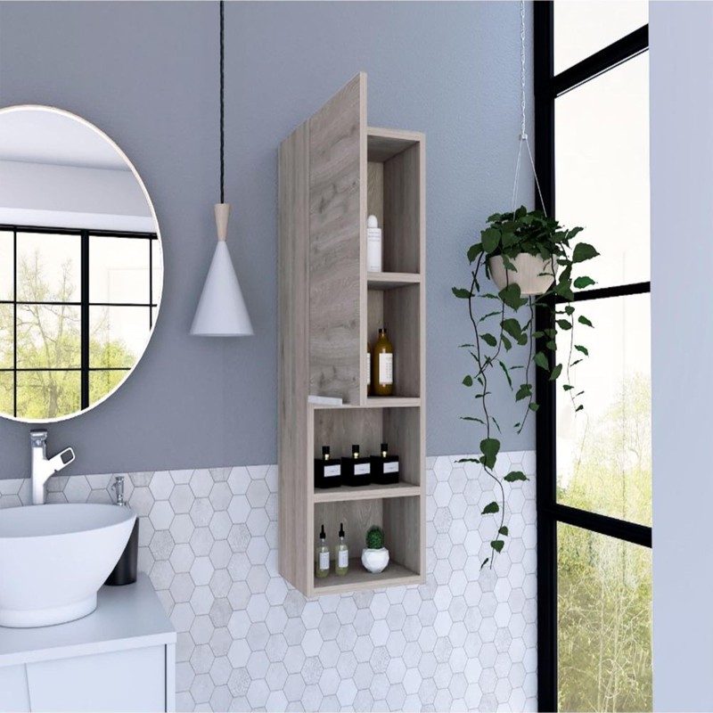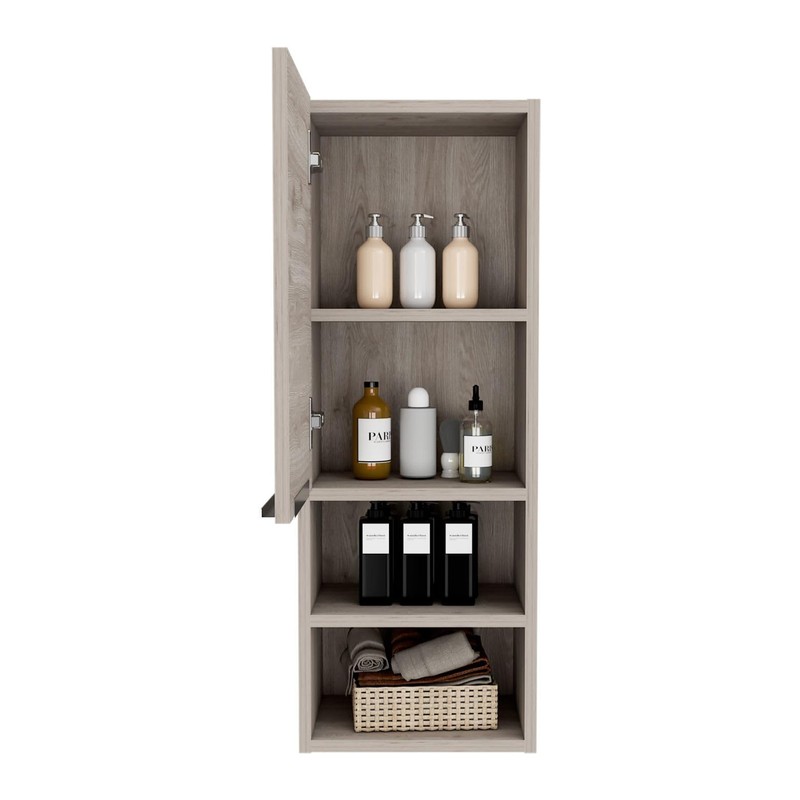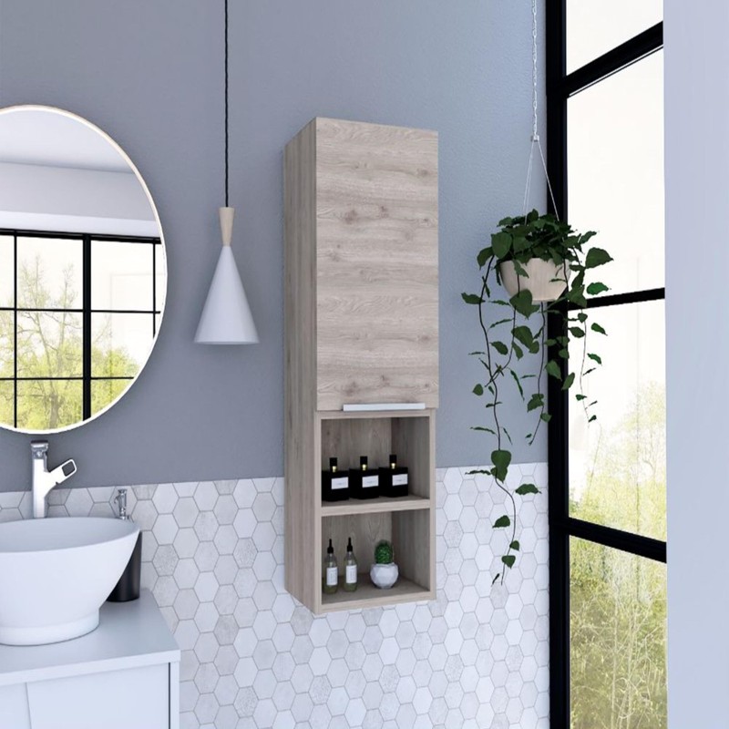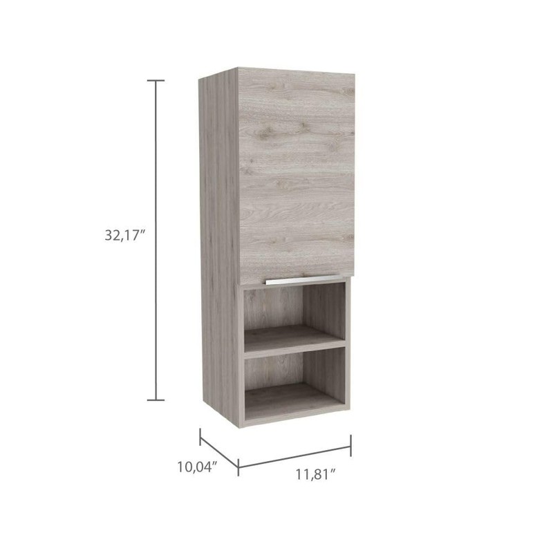 This medicine cabinet features a single door and a modern design in light gray, making it an addition to your bathroom or any room where extra storage is required. Its 32-inch height makes it smaller spaces while offering storage solutions.