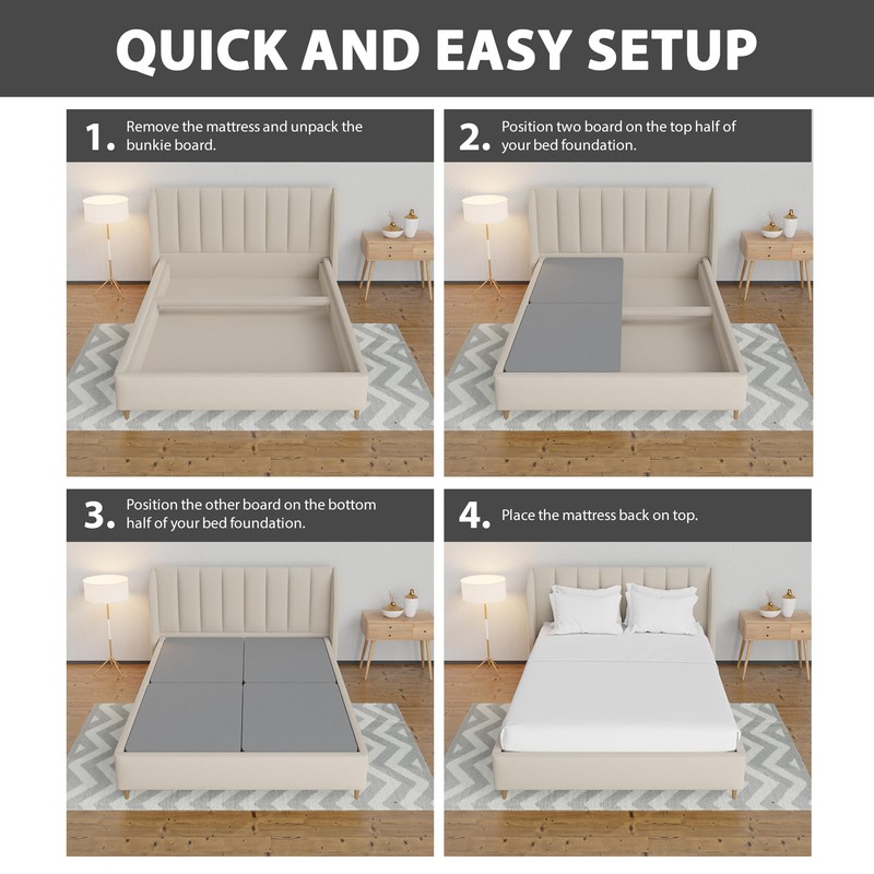 - BUNKIE BOARD COMES SPLIT IN FOUR HALVES: Bunkie Board Queen Comes in a split design, which makes them easy and convenient to carry and maneuver through narrow hallways and doorways.