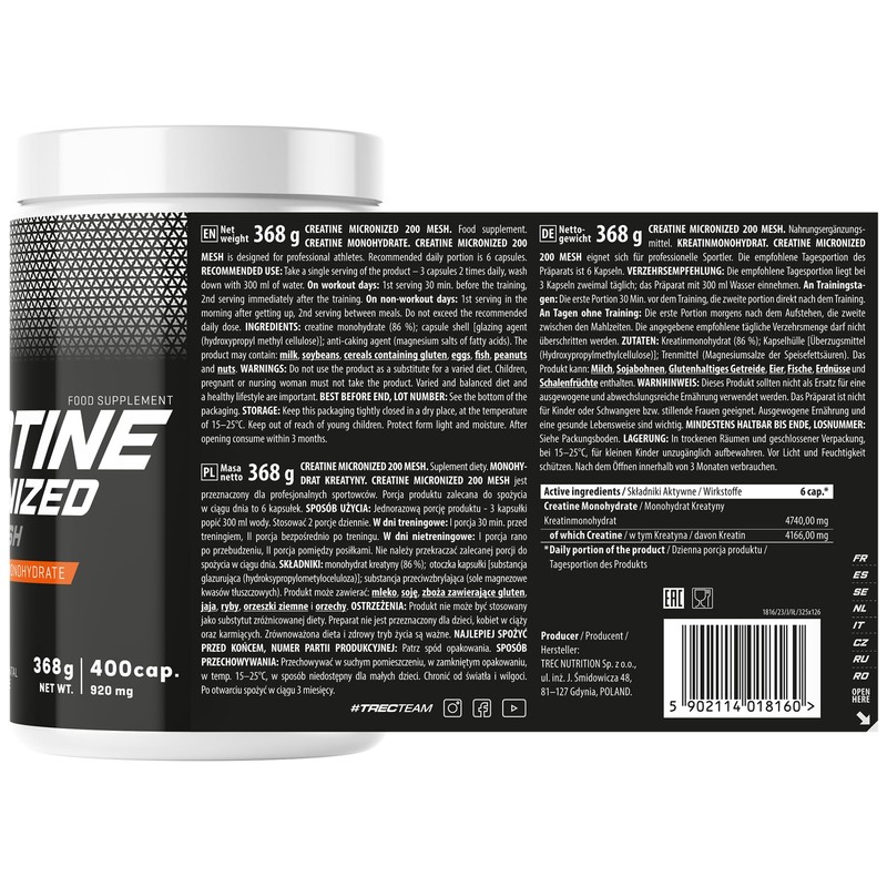 Trec Nutrition Trec Nutrition Creatine Micronized 200 Mesh 1 Pack x 400 Capsules - Creatine Micronized Monohydrate - Supplement for Muscle Strength - No Additives - Pills