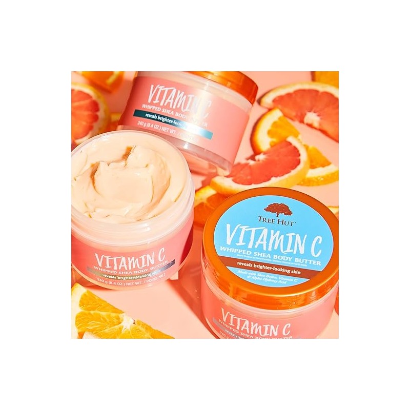 La línea de Whipped Body Butters de Tree Hut humecta tu piel al máximo sin dejar una sensación grasosa. Nuestra fórmula de Vitamina C está elaborada con ingredientes extra-hidratantes como manteca de karité y ácido alfa hidróxido. Además contiene Vitamina C, el poderoso antioxidante que mejora el tono de tu piel y la reafirma para que luzca radiante. En Tree Hut ofrecemos productos de la más alta calidad para el cuidado de la piel con el objetivo de mejorar y enriquecer tu rutina de baño. Creemos que todos merecemos sentirnos bien de pies a cabeza, por eso ofrecemos productos de belleza para que puedas tener un momento especial y relajante. Nuestros productos están elaborados sin parabenos ni sulfatos, con fórmulas hidratantes e ingredientes de origen vegetal, así como deliciosos aromas de alta duración. Ama y cuida tu piel con nuestra colección de mantecas corporales ligeras que hidratan y nutren profundamente.