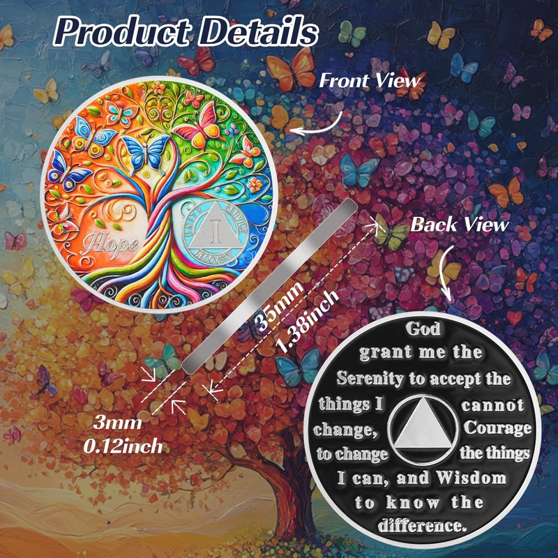 - Inspiring Journey Design: The Hopeful Tree design on the front of the sobriety chip reminds us that recovery is a process of growth, renewal, and transformation. Each butterfly represents personal growth and change, while the tree itself reflects strength, rootedness, and resilience. The words "Hope" and the intricate design highlight the theme of rising above adversity and finding freedom, making this sobriety medallion a beacon of hope and a reminder of the potential for transformation