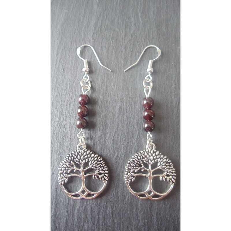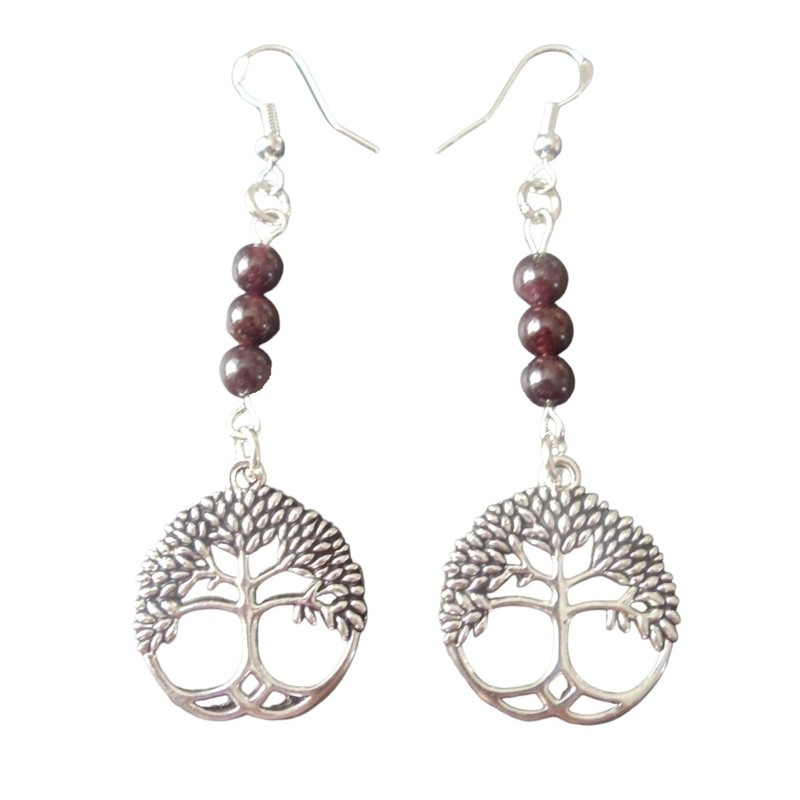 These lovely earrings are 6.8 cm in total length from the top of the earring hook. The Tree of Life Charm measures 2.2 x 2.6 cm and is made from Tibetan Silver. 6mm Garnet Beads (Garnet from Sri Lanka). The earring hooks are 925 sterling silver and the remaining components are nickel free sterling silver plated metals.