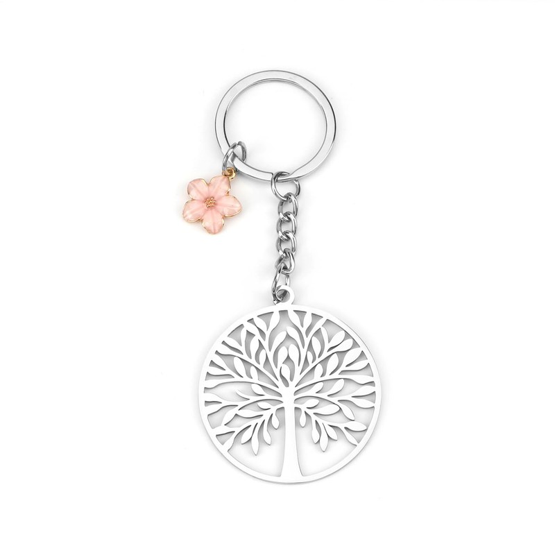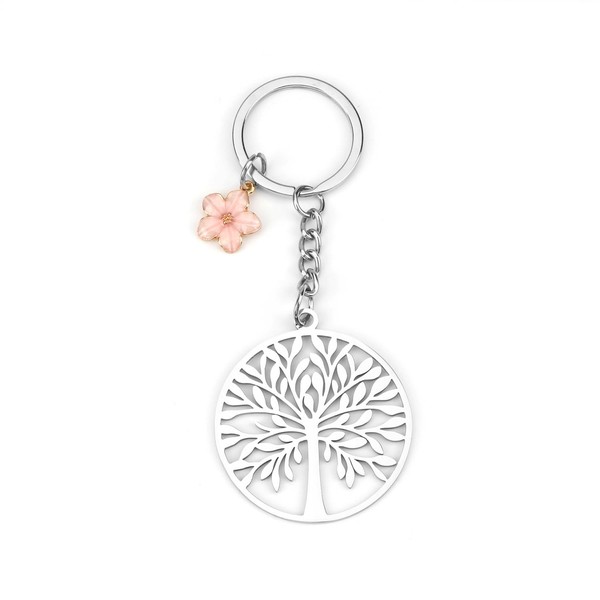 Tree of Life Keyring, Round Tree of Life Pendant with Flower, Lucky Charm for Women, Key Ring Keychain Jewellery, Spiritual Esoteric Gifts, silver, S