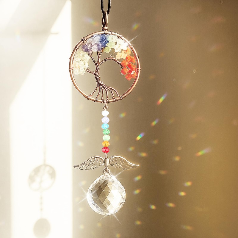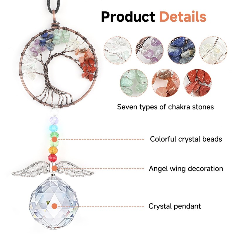 - Composition & Energy: This crystal suncatcher centers on a Tree of Life, arranged with chakra-healing stones, the last connets a prominent white crystal. Each spiritually attuned gem synergistically emits positive energy flows through their vibrational interaction