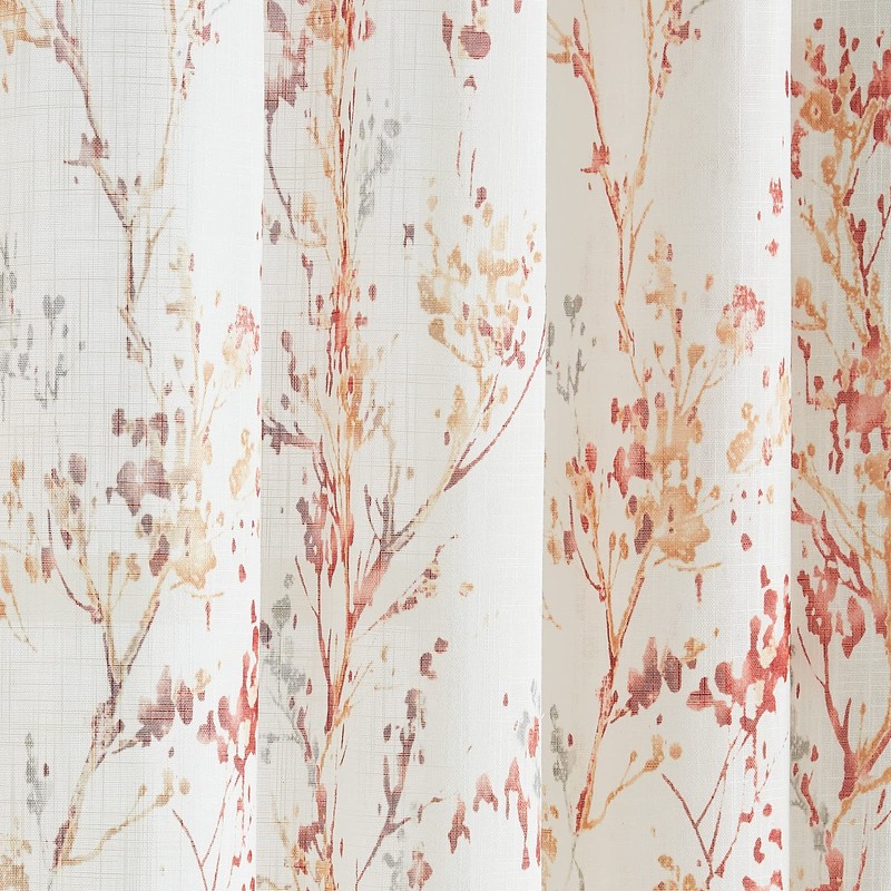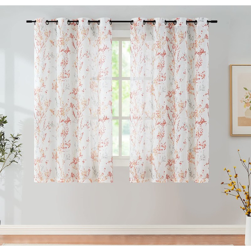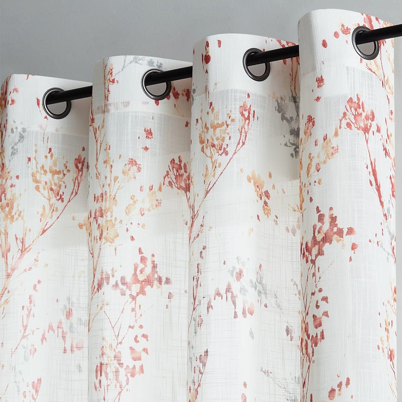 - Vibrant red, orange and grey print branch on white sheer curtains will match perfectly with a wide range of home styles.