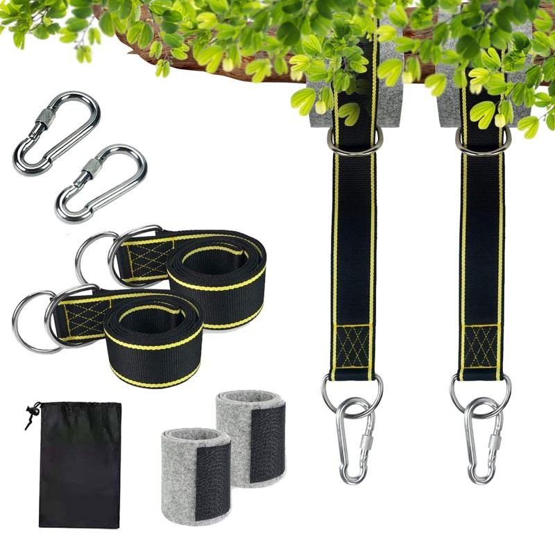- 🌴【Packing List】 Tree swing straps hanging kit contains 2 x 6.56FT swing straps, 2 x screw lock carabiners, 2 x tree protectors, 1 x carrying bag. Easy to set up: 1. Place the straps on the tree branch/pole. 2. Place one D-ring end through the other end and pull down to tighten. 3. Install the climbing buckle. 4. Hang the carabiner on the swing/hammock.