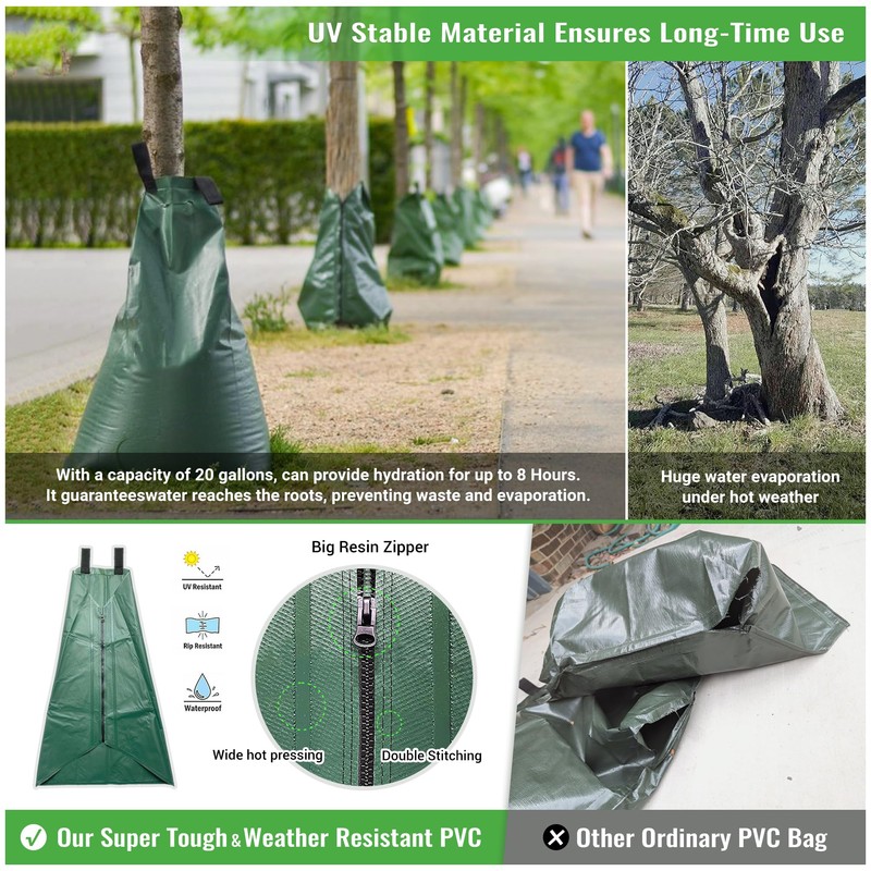 - 3.Easy to Install & Use – Simply wrap the watering bags for tree around the tree trunk, zip it up, and fill it with water using a standard garden hose. No special tools or complicated setup required. The large fill opening allows quick and hassle-free refilling, while the self-draining system takes care of slow water release. Suitable for trunks up to 4 inches in diameter, or you can zip multiple bags together for larger trees.