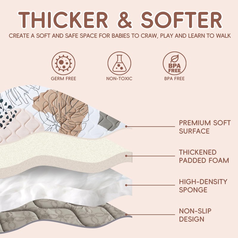 • Ultra-Plush & Supportive Comfort - Crafted with premium soft-filled foam and a waterproof, breathable fabric top layer, our extra-thick infant playmat creates the ideal cushioned surface for tummy time, crawling practice, and early motor skill development. The breathable, non-toxic materials provide a comfortable and safe exploration space for your little explorer.