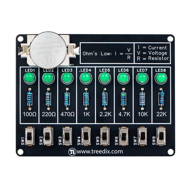 - Easy to understand: The brightness of each LED decreases as resistance (ohm value) increases, so learners can understand the relationship between current and resistance in a circuit.
