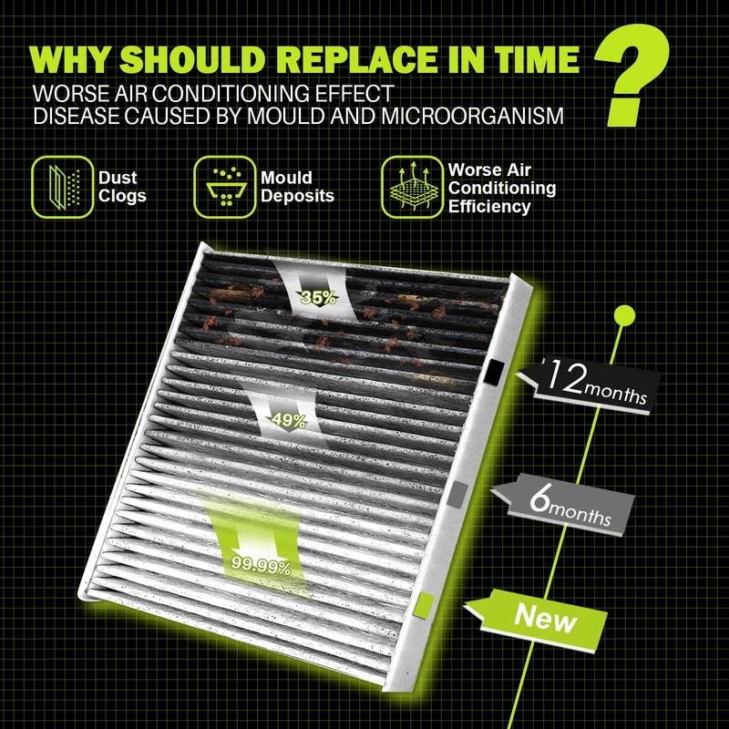 - Replace on Time: Cabin air filter is kind of consumable as dust and dirt will accumulate on the inlet surface, leading to a decline in filtering efficiency over extended use. Due to varying usage scenarios, the specific timing for replacement differs.