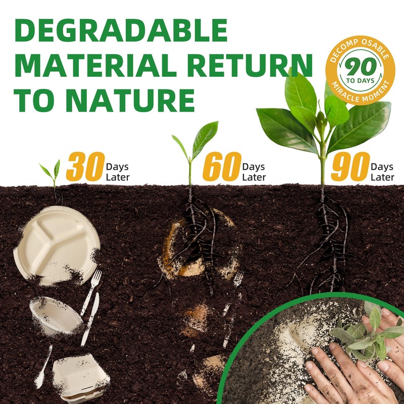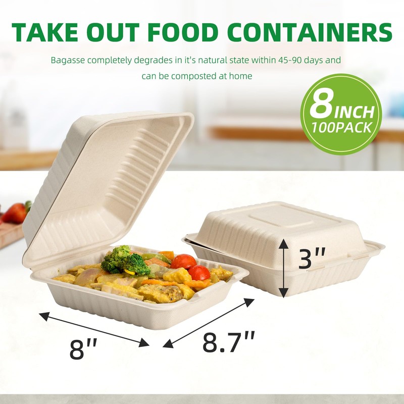 - [Value Pack] 8"x8" 100 pack biodegradable take out food containers without any plastic or wax coating to ensure your health and safety during your meal. It can be directly tossed into your compost bin after use and have a great meal without washing dishes,helping you save cleaning time. If you have any questions, please feel free to contact us