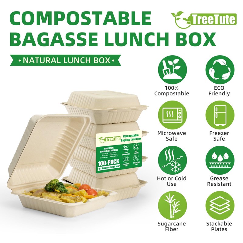 TreeTute [8”X8” 100-Pack Compostable Clamshell Take Out Food Containers with Lid, Disposable Heavy-Duty To Go Containers Lunch Box, Eco-Friendly Biodegradable Bagasse To Go Boxes for Restaurant,Party