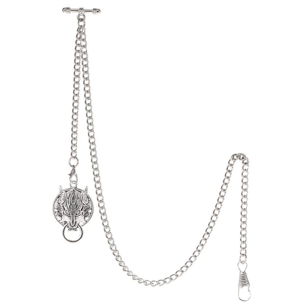 TREEWETO Men's Albert Chain Pocket Watch Curb Link Key Chain 2 Hooks with Antique Wolf Silver Pendant Design Charm Fob T Bar