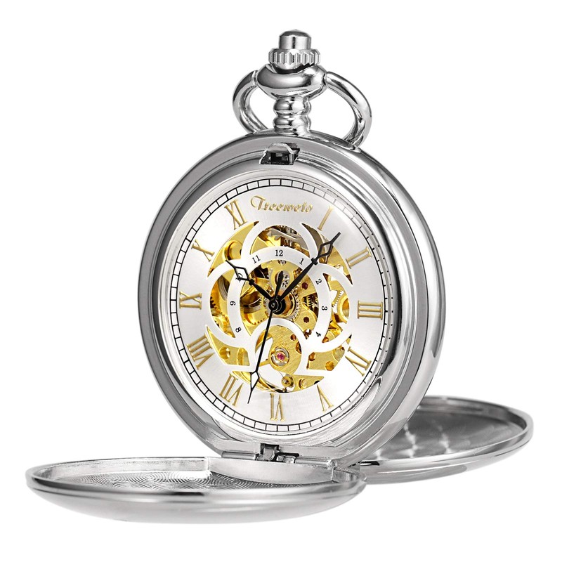 TREEWETO Men's Women's Pocket Watch Steampunk Skeleton Mechanical Silver Fob Retro Watches Double Case