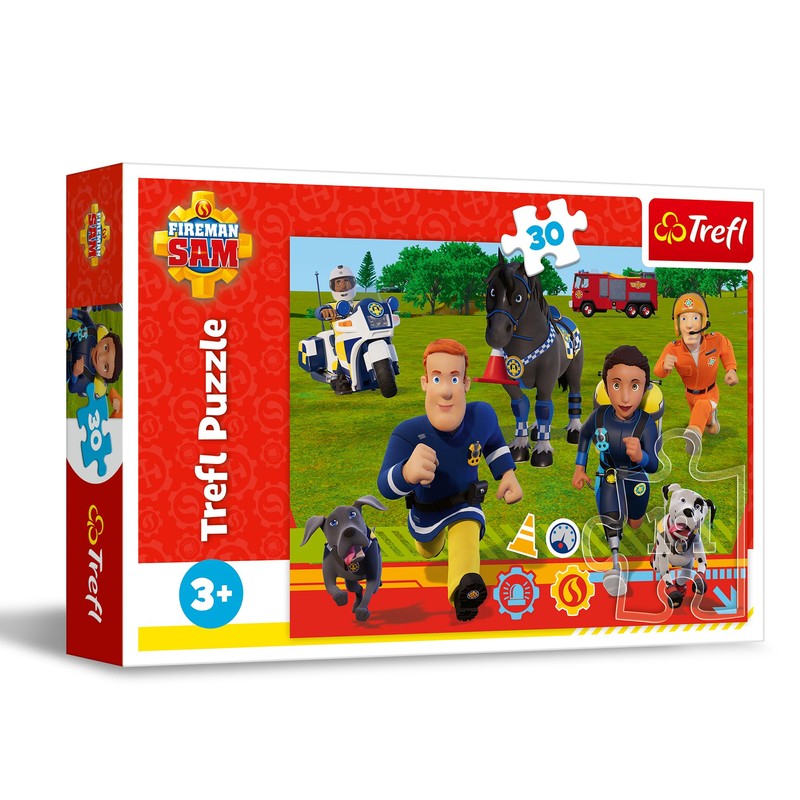 - The puzzle consists of 30 pieces, after assembling the puzzle, a picture with the dimensions 480 x 340 mm is created, which depicts the figures of the TV series Fireman Sam ready for the rescue action