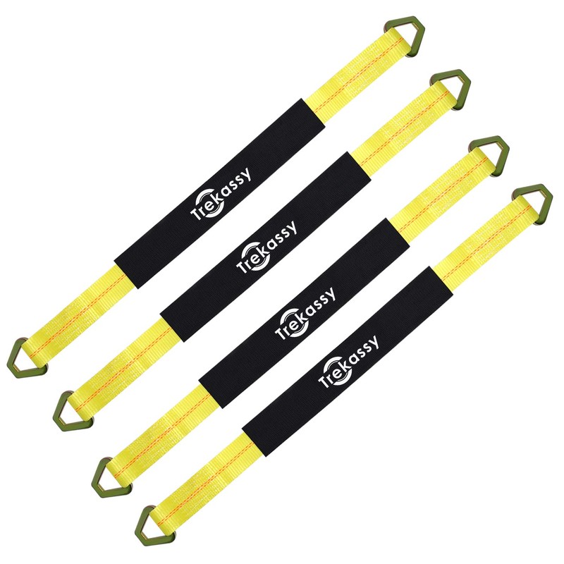 When transporting vehicles it is important to use good quality car and truck hauler tie downs with safety strength such as Trekassy axle straps. These are 4 Pack of 36" long 10,000lbs Rated heavy duty axle straps. They are used to tie down vehicles by wrapping around the axle, one of the strongest points on a vehicle, rather than the body or wheel, which provides safe and strong hold. **\- Compared to use chain binders in the car hauling,axle tow strap can avoid any scratches that may be caused to your rims or potentially paint. \- It can be sure that the car is adequately secured by using our heavy duty tie down straps with 10,000 lb break strength. \- Two metal flat D-rings are perfect mounting points for your ratchet straps with snap/ flat hook. \- Premium Industrial Grade polyester webbing with protective sleeves prevent the axle abrasion when hauling the vehicle. \- There are 2 ways to secure vehicles depending on your situation.Like using them parallel with four wheels or in a X pattern. If possible, cross the straps underneath the vehicle in a “X” pattern to evenly distribute tension, and prevent any side-to-side shifting during transit. ** NOTE: Make sure the straps are tight enough to secure the car but not so tight that they strain the axle. Never attach your straps to your vehicle’s bumper or luggage rack.This can loosen your straps and create a potentially dangerous situation. **Specifications: -Color: Yellow -Material: Industrial Grade Polyester -Width:2 Inch -Length:36 Inch -Break Strength :10,000lbs -Quantity: 4 Pack**