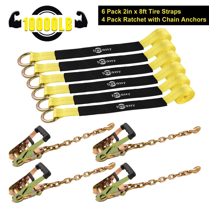 Durable and Heavy Duty with 3,333LBS Safe Working LoadTrekassy wheel straps are 2" wide coverage for less friction and made of industrial grade polyester material coating UV and wear resistance.Lab test with safe working load of 3333 lbs and break strength of 10,000 lbs. |