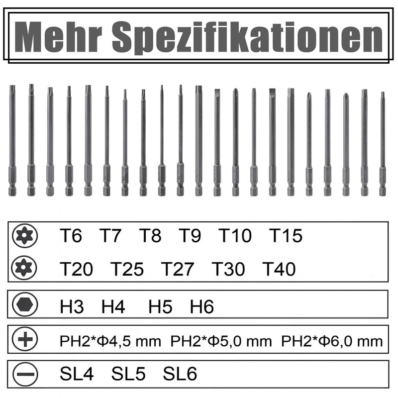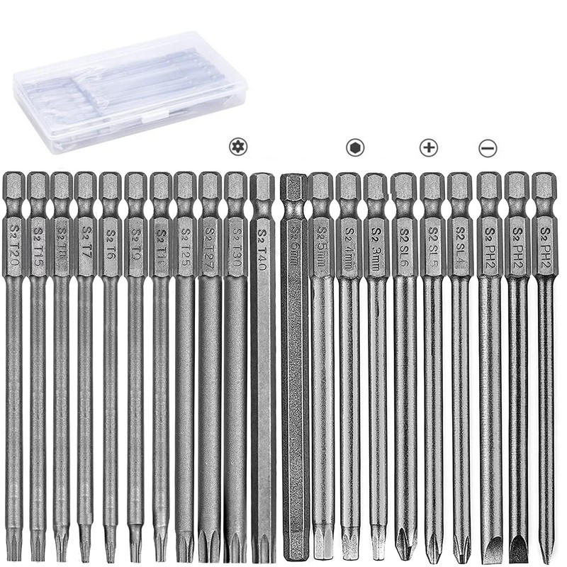 - Multiple shapes of 100 mm bits set - including long Torx bit set, long slot bit set, long hex bit set, long Philips bit set to meet different screw needs.