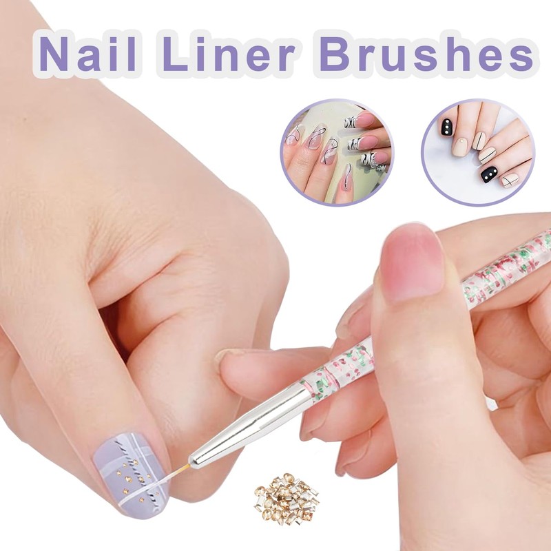 - The nail art set includes five dual-ended dotting pens, three nail liner brushes, five acrylic nail brushes, seven gel nail brushes, an 8-function nail brush, five silicone embossing pens, and one pack of mini rhinestones.