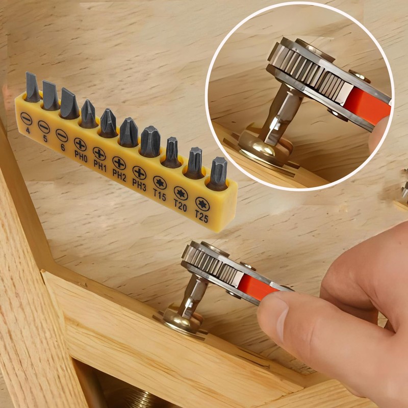 - Versatility: Ratcheting right-angle screwdriver with a 1/4-inch hex drive, includes 10pcs 1/4" Hex Drill Bits (Flatted, Phillips, Torx) for diverse needs.