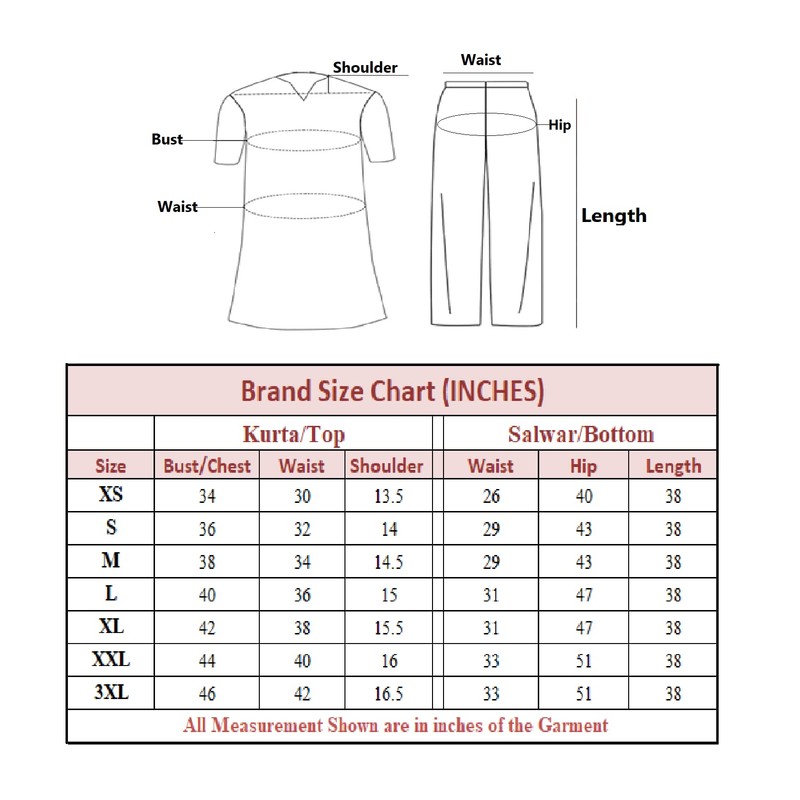 - Length: Kurta: 43 In; Sleeve: 18 In||Salwar: 38 In||Dupatta: 2.20 Mt [The model (height 5'8) is wearing a size S]