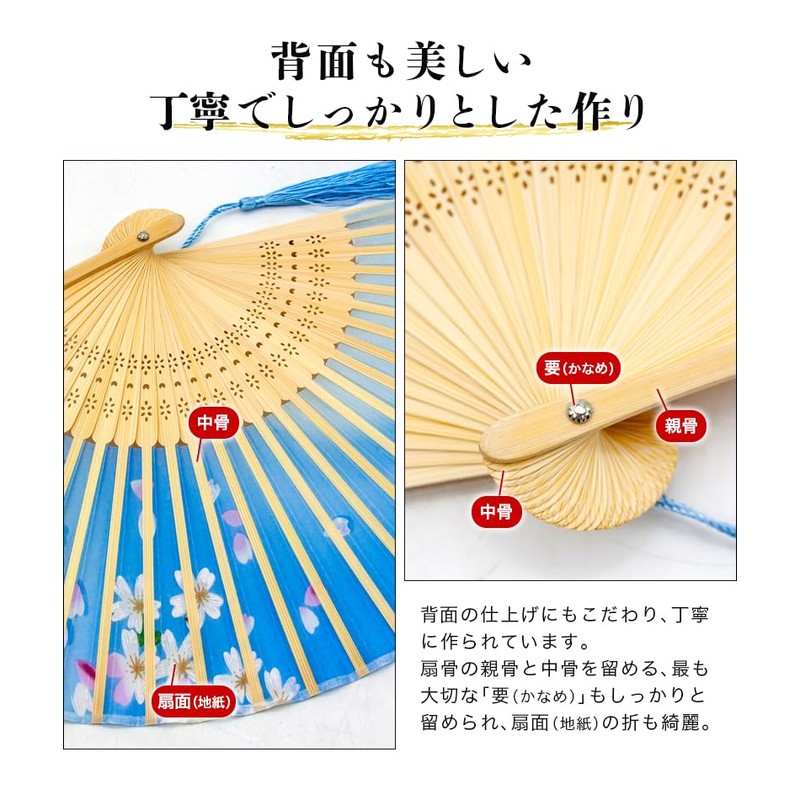 - (Details) The fan frame (middle rib): The openwork pattern is beautiful when opened. ■ Important Note: "Kaname" securely holds the ribs and the central bone. ■ Fan ribs (rib ribs): Thick and durable. It can be closed. ■Tassel: The surface has a tufted as decoration
