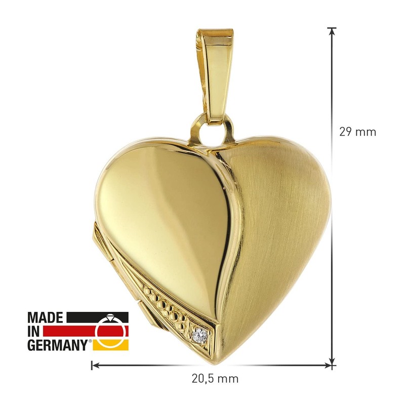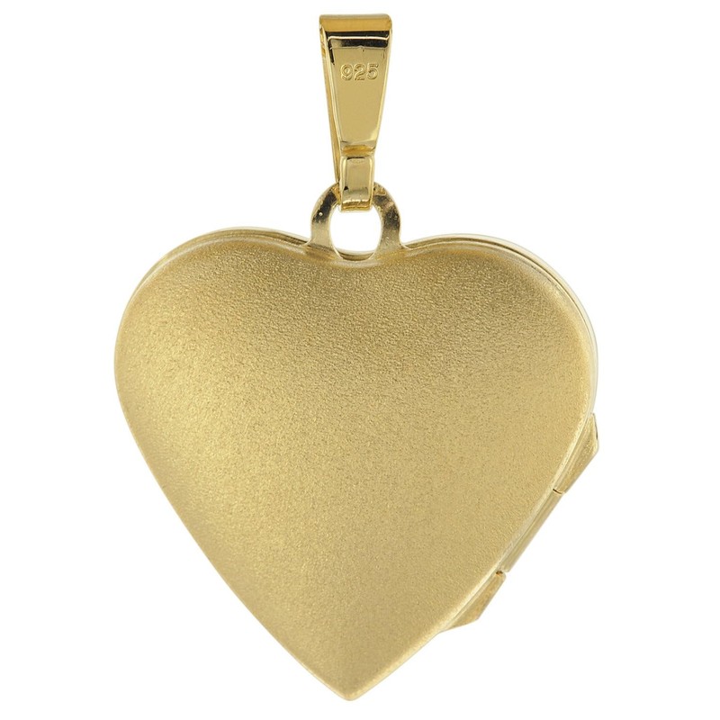 - Women's Locket Pendant Heart charm in gold plated silver, front with cubic zirconia, for storing photos. Chain made of gold-plated silver, 1.5 mm thick. Medallion (without eyelets) 20 x 20.5 mm