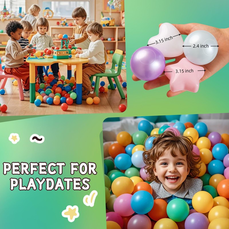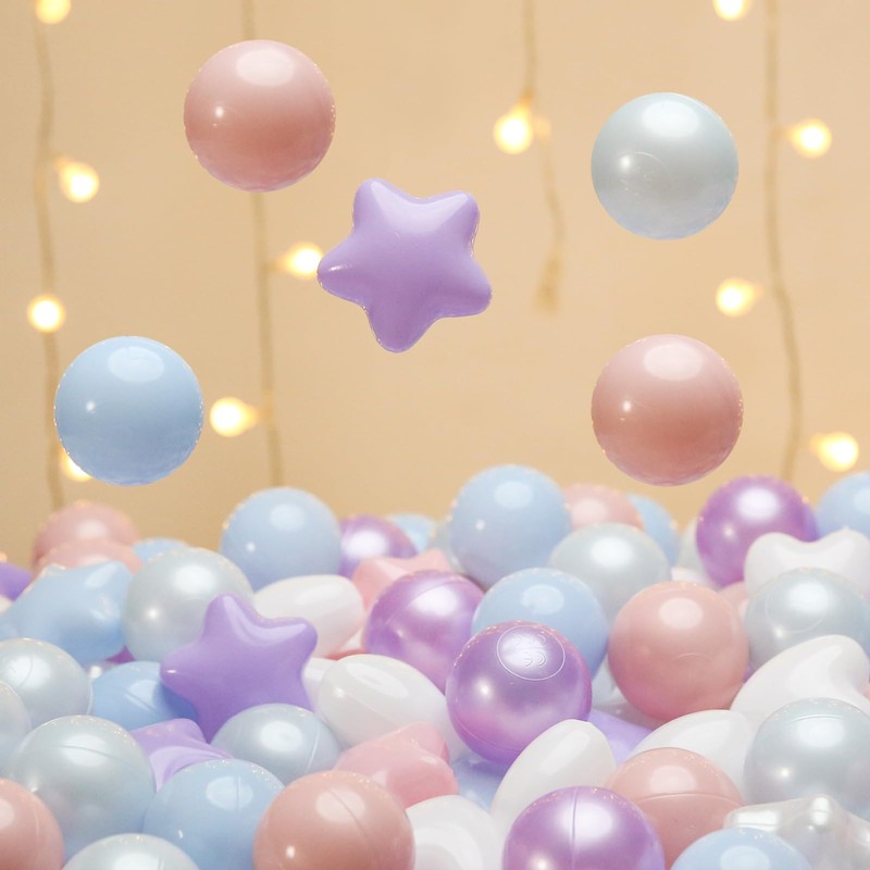 - Vibrant and non-toxic BIGGER star heart ball pit balls for toddlers, promoting safe and colorful play experiences. Available in pack sizes of 200 mix shaped balls, providing ample quantities for engaging ball pit setups. Cream Colors: Pink; Blue; Purple